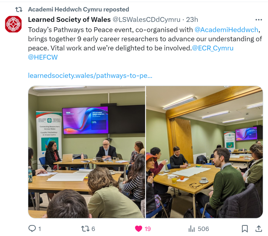 Yesterday I was thrilled to be one of the nine selected Early Career Researchers (ECRs) at the table of the Learned Society of Wales (LSW) facilitated Pathways to Peace Sandpit Event, part of a pioneering research programme orchestrated by Academi Heddwch Cymru (AHC), Wales’ first ‘peace institute’. With funding from the Welsh Government, AHC aims to cement peace as a cornerstone of both national and international discourse, leveraging a network of global peace institutes.