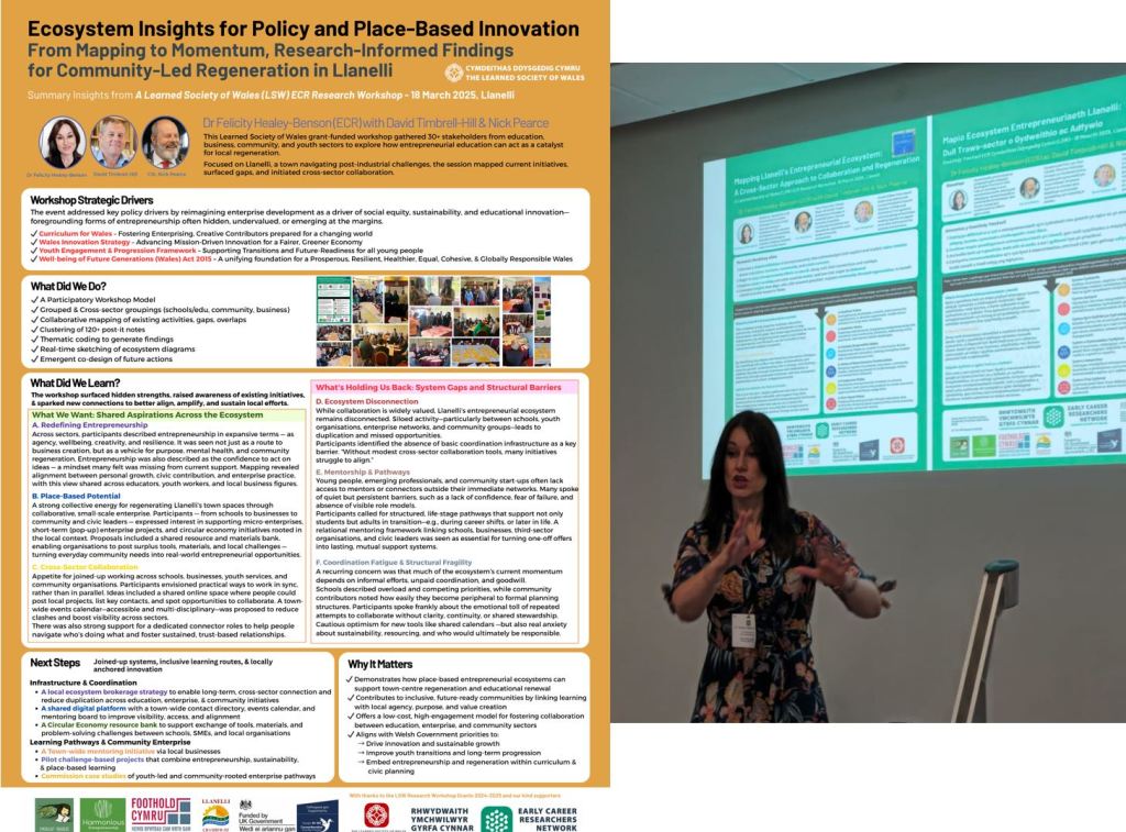 I was further delighted to share the LSW grant-funded Llanelli Ecosystem Mapping research, conducted with David Timbrell-Hill (Llanelli Chamber and Commerce) and Nick Pearce (Foothold Cymru) earlier this year, under the ‘A Prosperous Wales‘ theme. The work aims to surface community-rooted potential, challenge extractive logics, and foreground local voices in shaping sustainable, entrepreneurial futures. It was gratifying to see the research contribute to a wider conversation on place-based possibility—delivering on a promise made to bring Llanelli’s innovation landscape into fuller view.