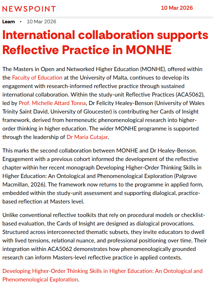 Thrilled to share news of an international collaboration with colleagues at the University of Malta, where my Cards of Insight framework, recently published in my new book, has been integrated into the Masters in Open and Networked Higher Education programme. It is encouraging to see phenomenological research into higher order thinking infusing practice in this way, supporting reflective dialogue and deeper pedagogical attentiveness within Masters level study.